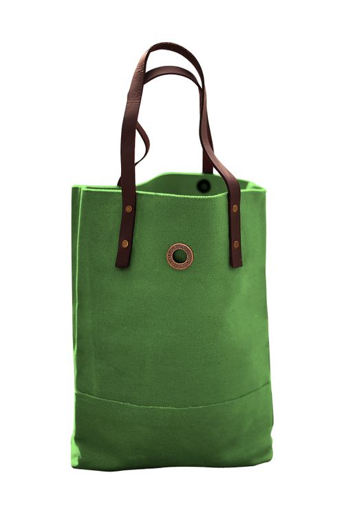 Carry bag of waxed canvas, green. Handle in heavy harness leather fastened with brass rivets. Dimensions: Width: 32 cm Depth: 7 cm Height: 40 cm